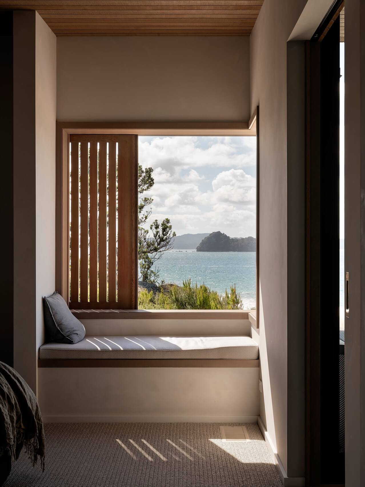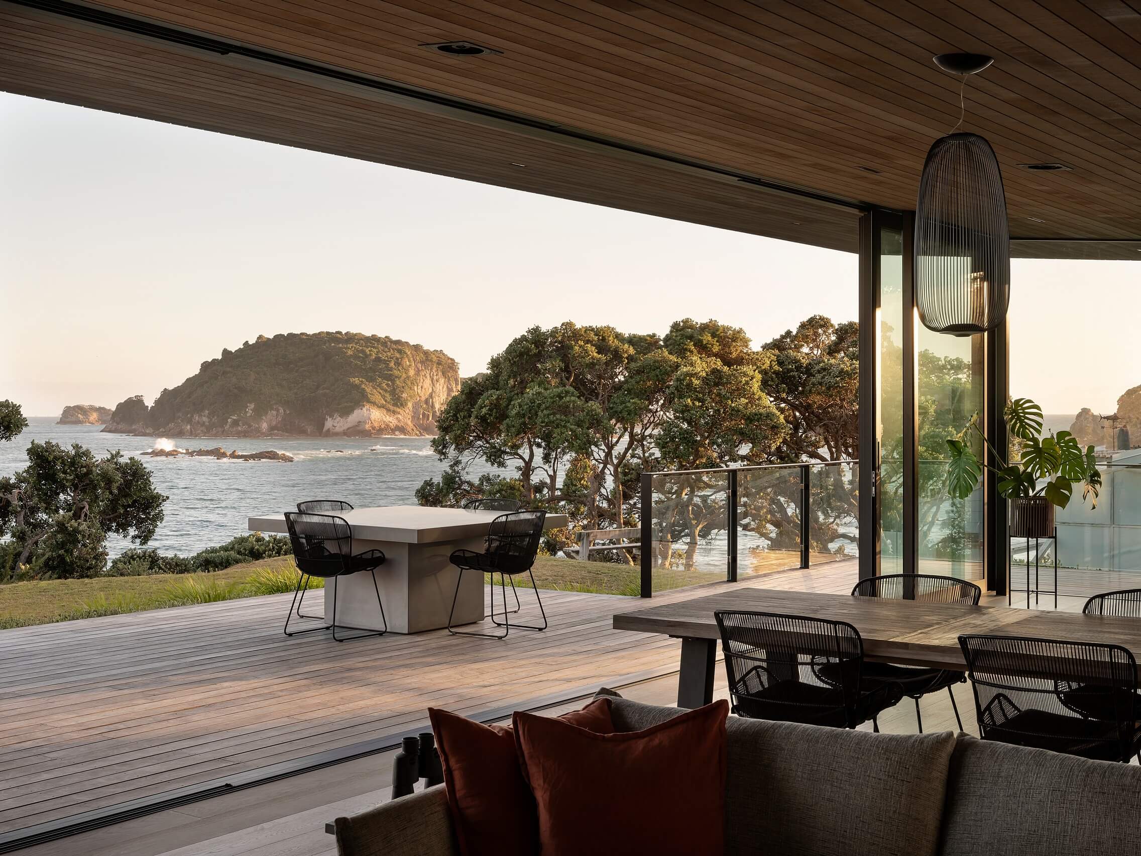 When viewed from below the long roof hangs between tenacious pohutukawa that bookend the site, the weathered cliff anchoring the bold, built form. Third level living allows the home to embrace the breath-taking view, celebrating the coastal panorama without dominating the treelined crest.