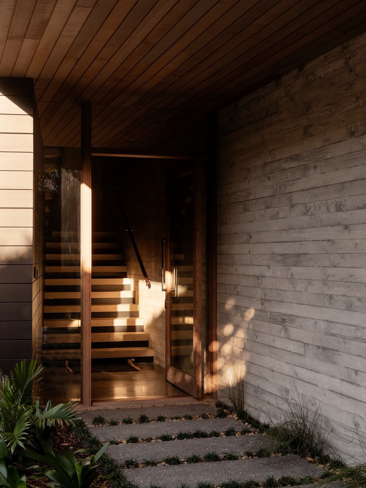 In contrast, the austere approach reveals nothing of the experience to come, a textural ascent, a moody study of material expression, spatial compression and a magical release to the light.
