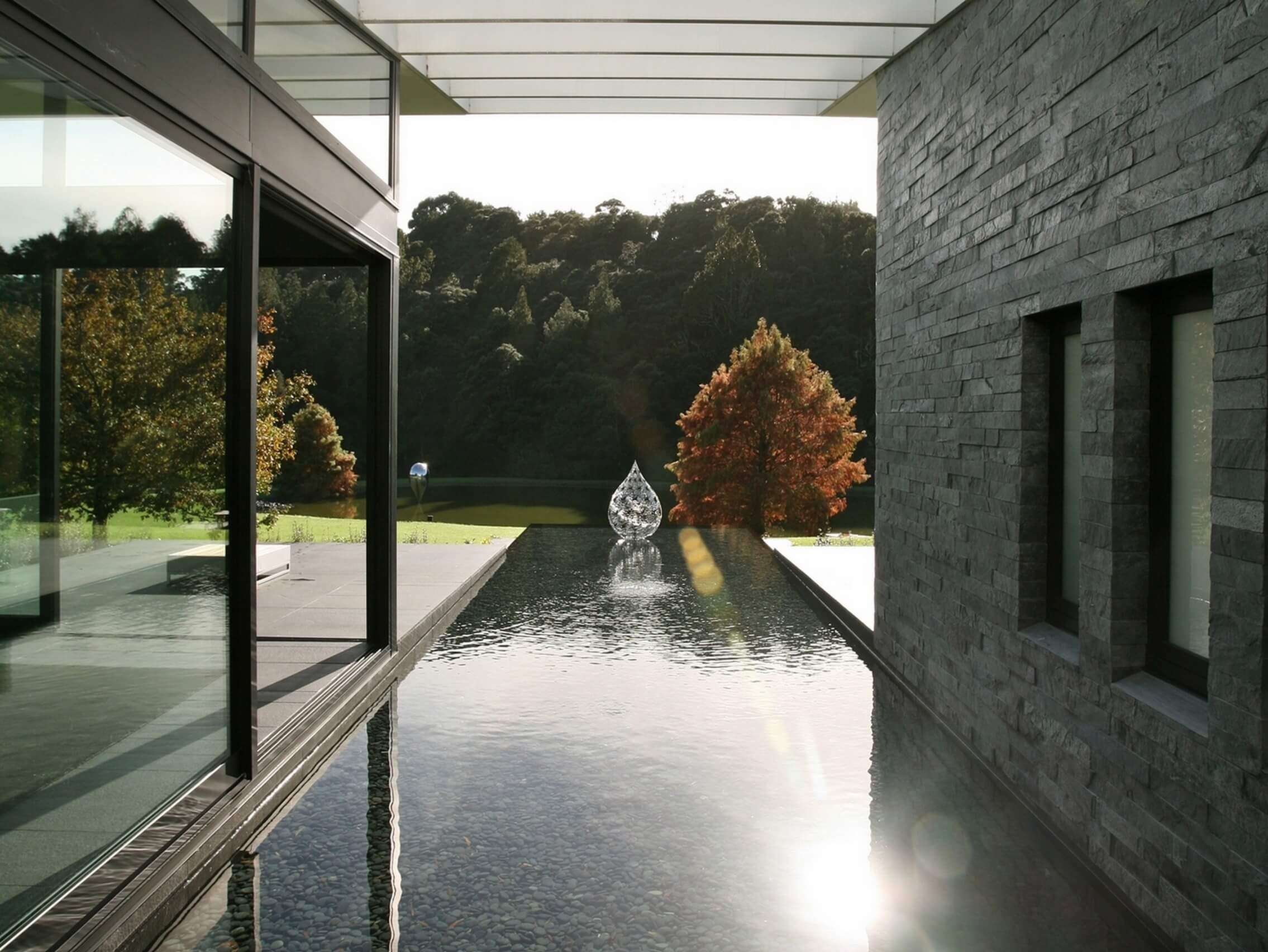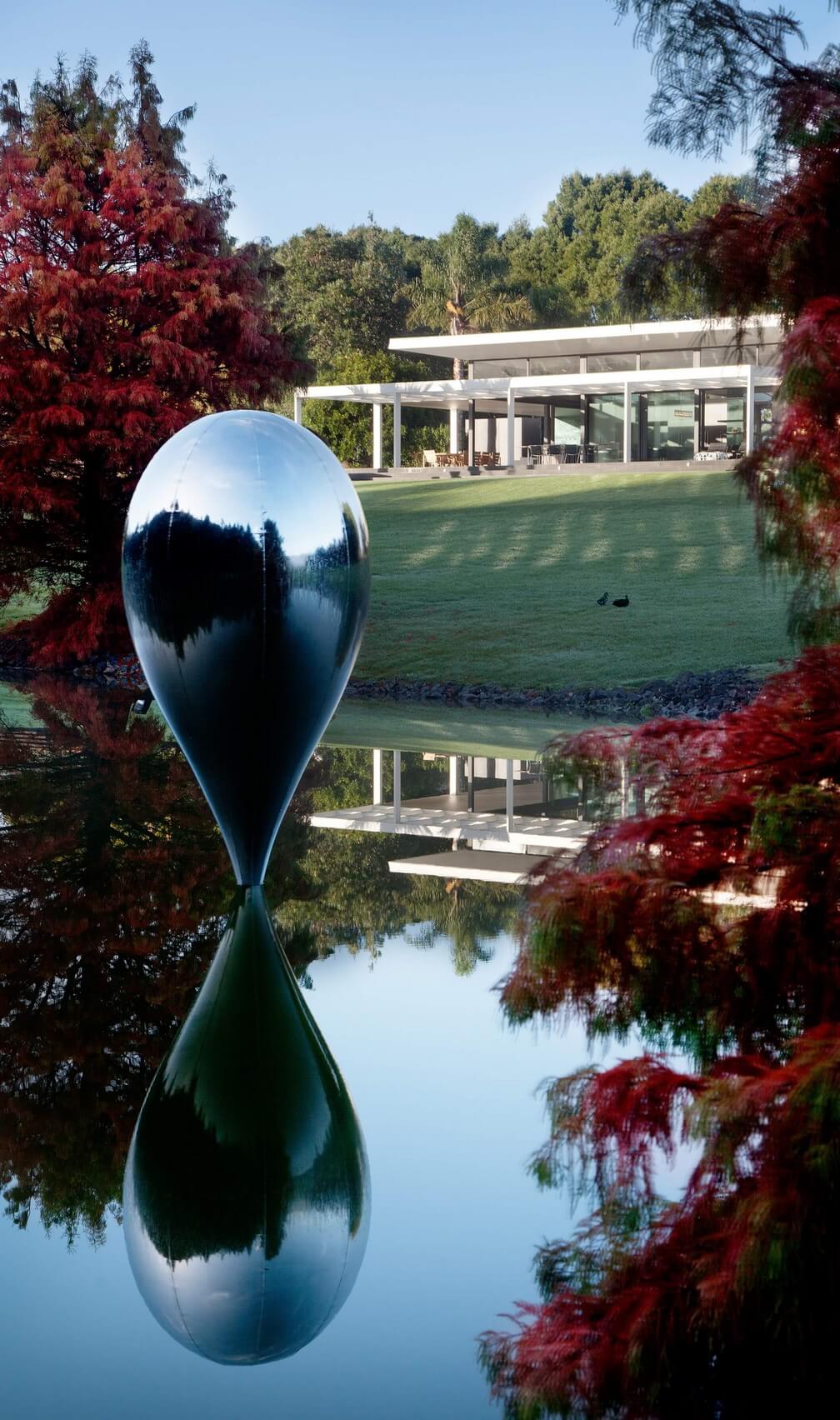 Broad, floating roofs provide elegant shelter, framing the beautiful grounds while exquisite sculpture draws the eye to distant views. A contemporary, country clubhouse that celebrates the owners creative expression and uncompromising vision for the property.
