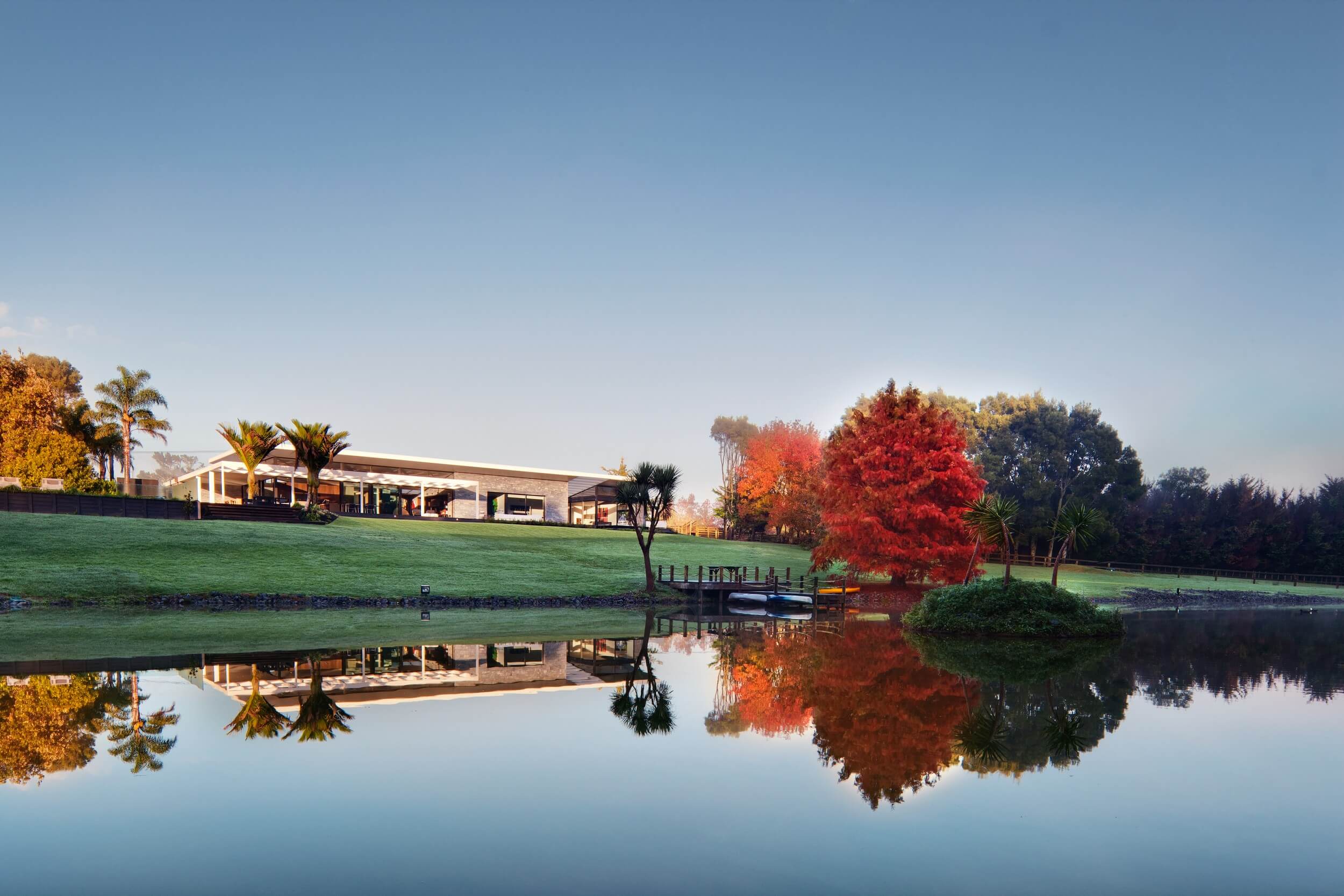 A manicured rural landscape and a collection of contemporary New Zealand art led to a refined gallery home. The interior is grounded by textured stone walls that extend outside, book-ending the wide social terrace and graceful verandas.